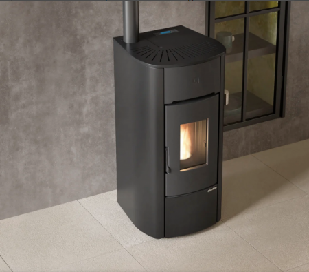 Nordica Extraflame, poêle à pellet pour maisons passives et/ou à basse consommation d’énergie. Revêtement en acier et top en majolique